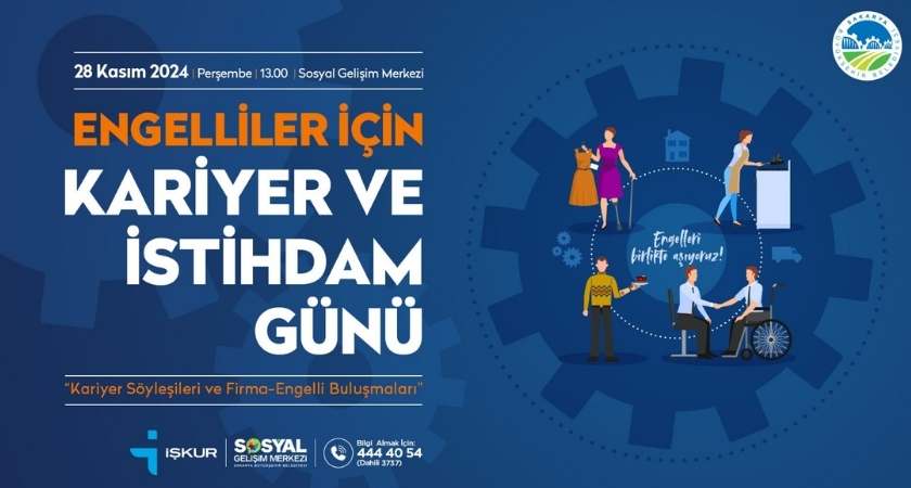 Sakarya Büyükşehir Belediyesi ve İŞKUR ortaklığında “Engelliler için Kariyer ve İstihdam Günü” SGM’de düzenlenecek. 28 Kasım Perşembe günü saat 13.00’te kariyer söyleşileri ve firma-engelli buluşmalarıyla engelli bireylerin çalışma hayatına adım atması için zemin oluşturulacak.