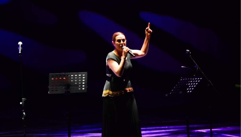 Gecede Bursa Kültür Sanat ve Turizm Vakfı (BKSTV) Yönetim Kurulu Üyesi Elif Özhan, sanatçılara teşekkür ederek festival plaketini sundu.