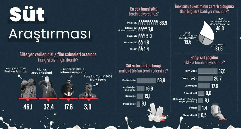 Araştırmanın eğlenceli sorularından biri de dizi ve filmlerdeki ikonik süt sahneleri. Avrupa Yakası’nın unutulmaz karakteri Burhan Altıntop’ın süt içme sahnesi yüzde 46,1 ile en ikonik sahne olarak seçiliyor. Yine unutulmazlardan biri olan Friends karakteri Joey Tribbiani’nin sütü başına diktiği eğlenceli sahne yüzde 32,4 ile ikinci seçiliyor. Genellikle saflığı ve temizliği temsil eden süt, bazı film ve dizlerde ise ters köşe bir sembol olarak kullanılarak tehlikeyi çağrıştırıyor. Bu anlamdaki en ikonik film sahneleri ise Suspicion (Yüzde 17,6) ve Peeping Tom (Yüzde 3,9) seçiliyor.